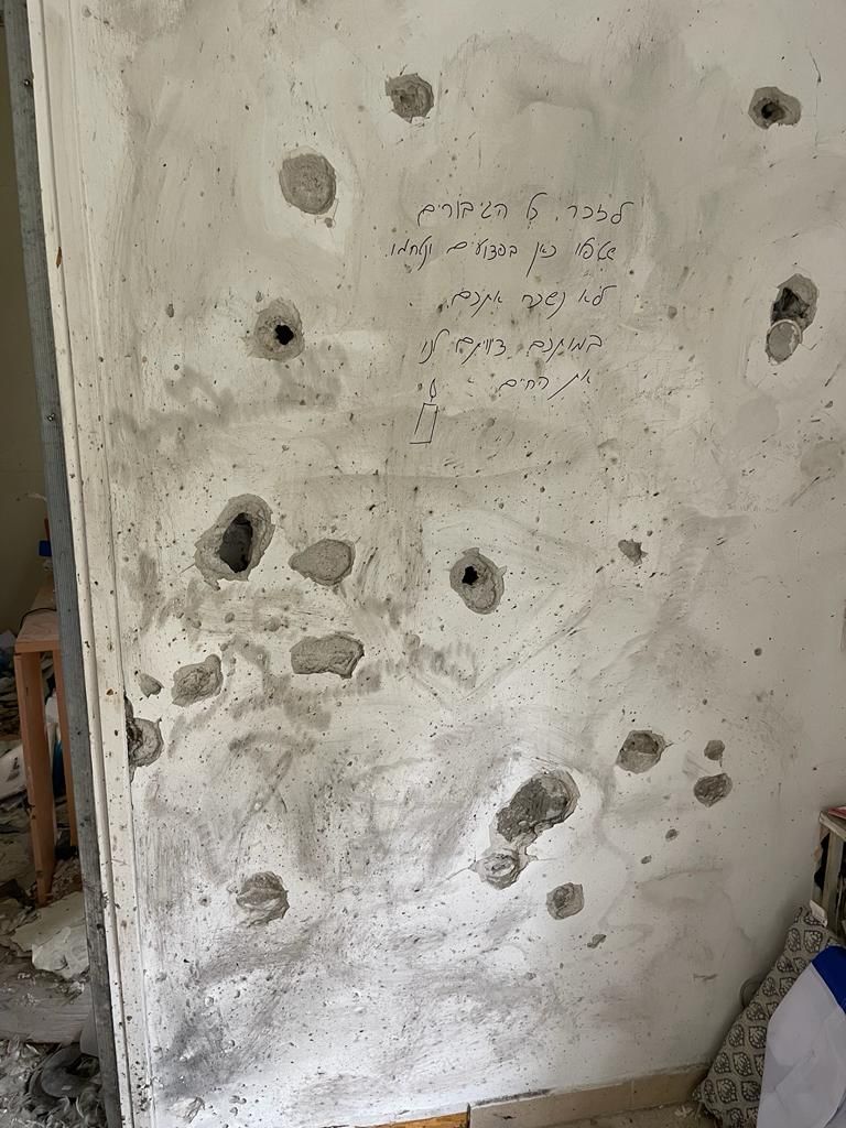 Los impactos de bala sobre una pared y un mensaje escrito a mano por los supervivientes de uno de los días más oscuros de la historia de Israel.