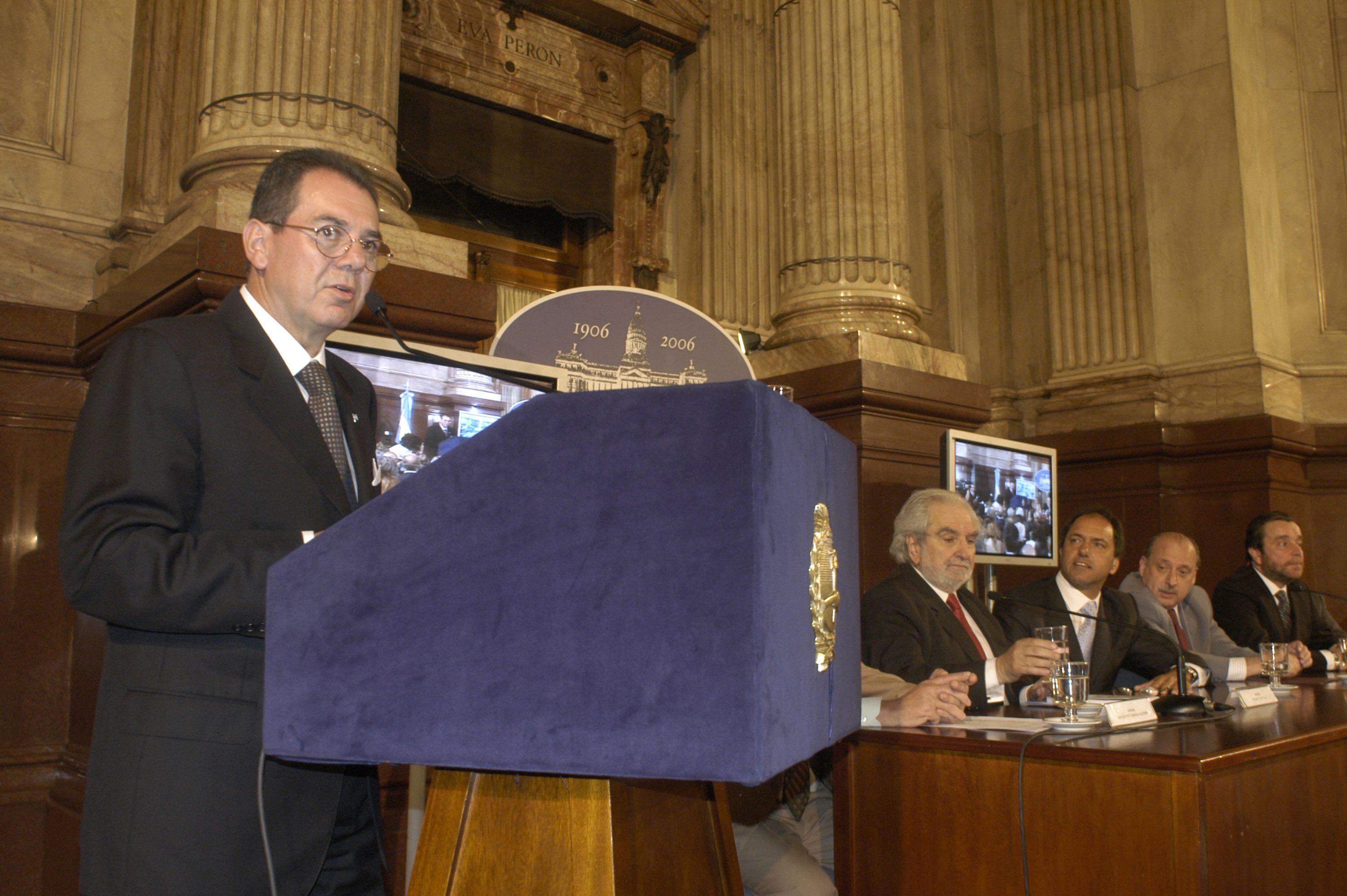 Invitado especialmente por Taeda, el ministro de Defensa de Brasil, Nelson Jobim, brinda una conferencia en el Palacio Balcarce, de la que participan funcionarios, diplomáticos y representantes del sector público y privado de nuestro país.
