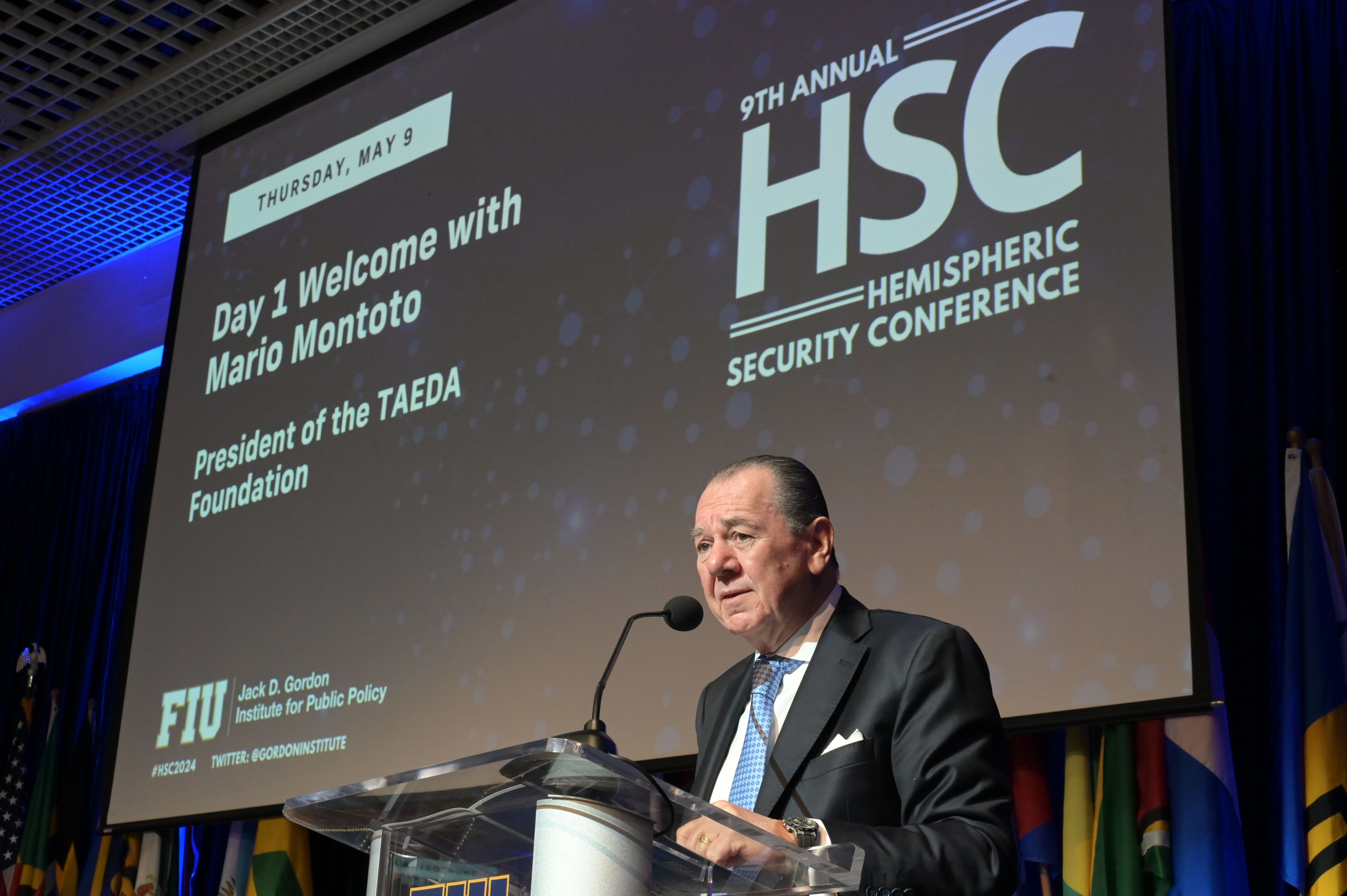 Mario Montoto, presidente de Taeda, dirige su discurso de apertura de la 9.ª Cumbre de Seguridad Hemisférica, organizada junto a la Florida International University (FIU) en Miami.